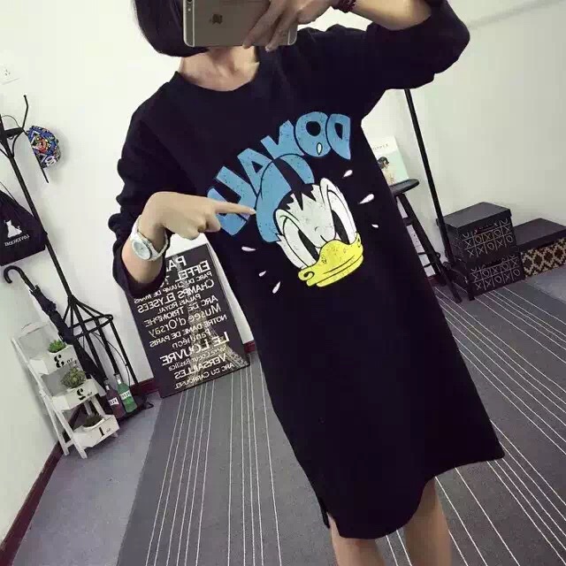 韓國原單款 秋冬女裝寬松大碼羊毛拉架唐老鴨印花長袖T恤裙女 /