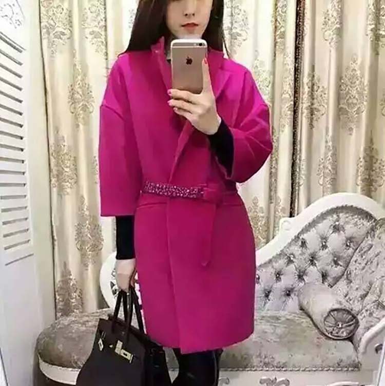 2015秋冬新款女裝韓版羊毛呢大衣女式訂鉆腰帶風衣七分袖翻領外套 /