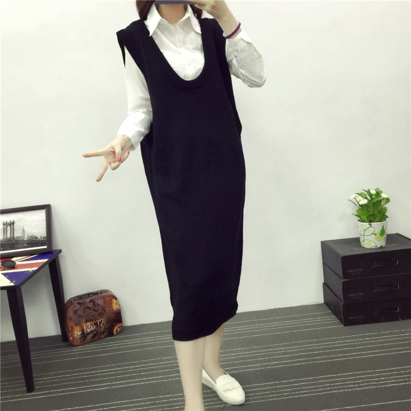 東大門秋冬韓版寬松大碼無袖馬甲背心長裙超長款純色毛線連衣裙 /