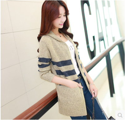 2015秋季新款韓版寬松毛衣外套女開衫中長款純色口袋帶帽針織衫 /