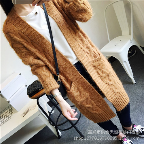 2015復古麻花針織口袋寬松顯瘦純色中長款開衫外套女裝 /