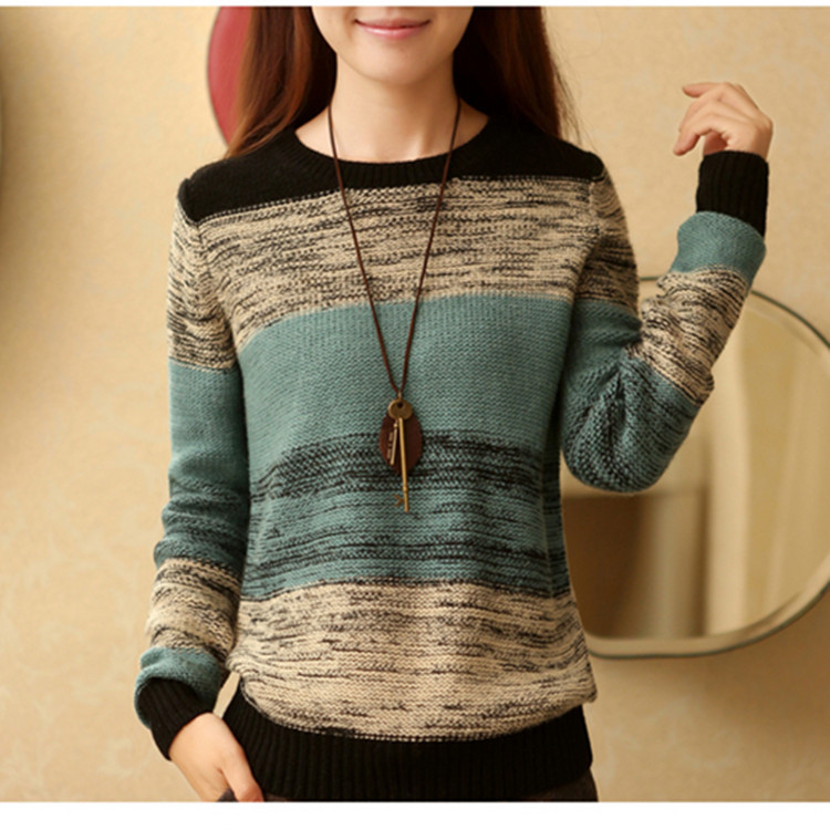 2015秋冬季新款女裝毛衣外套寬松圓領撞色套頭針織衫打底衫女加厚 /