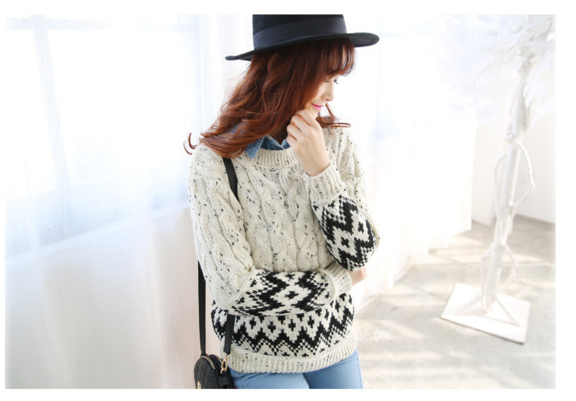 2015秋冬新款韓版麻花針織撞色菱格提花圓領長袖套頭毛衣女 /