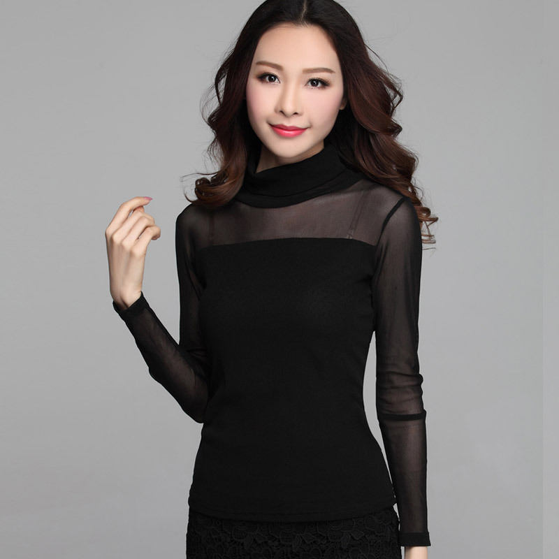 秋天大碼女士網(wǎng)紗打底衫女春秋薄款潮單件 高領(lǐng)時尚長袖紗衣t恤 /