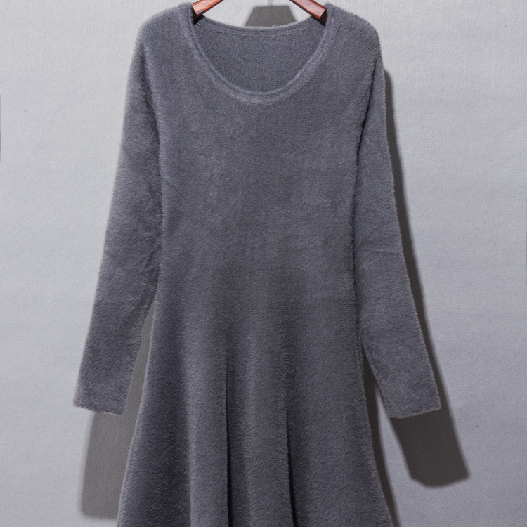 歐洲站2015冬款女裝純色貂絨長(zhǎng)袖套頭中腰圓領(lǐng)連衣裙 /