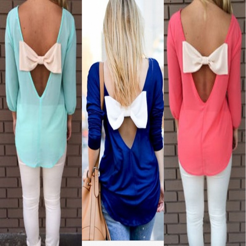 速賣通Ebay外貿(mào)歐美圓領(lǐng)長(zhǎng)袖露背蝴蝶結(jié)透視雪紡衫 五色4碼 /