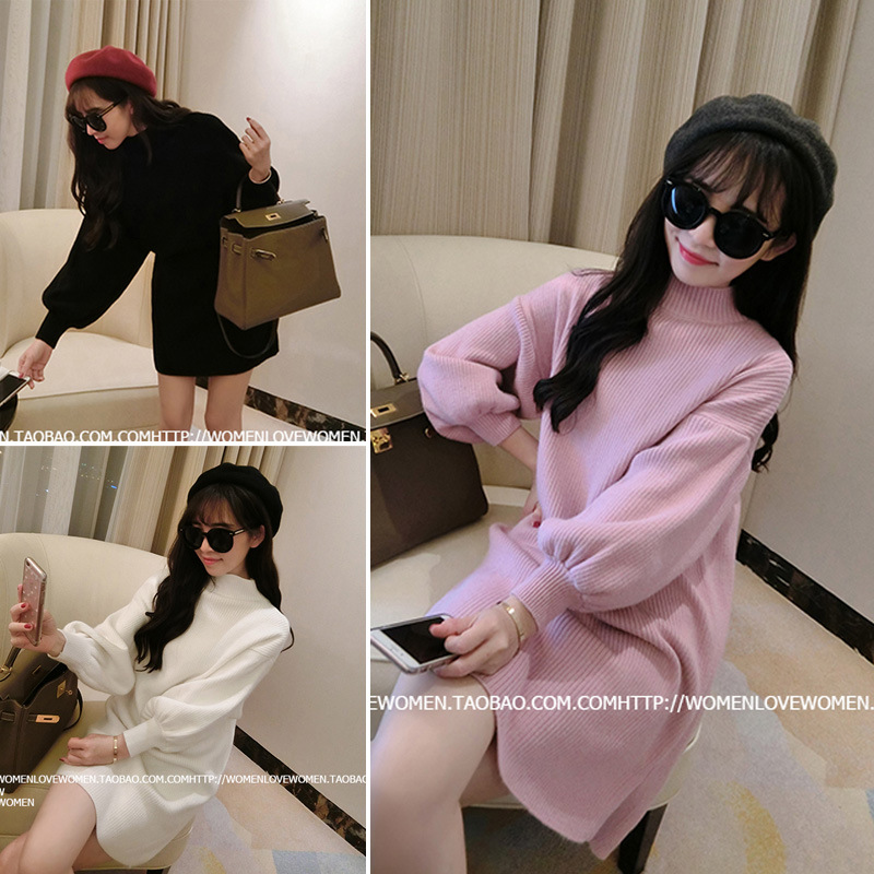冬裝新款韓版寬松燈籠袖半高領中長款開叉擺毛衣連衣裙女 /