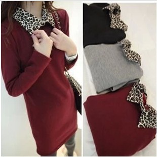 2015秋冬新款豹紋翻領加絨打底衫 中長款加厚長袖打底T恤 /