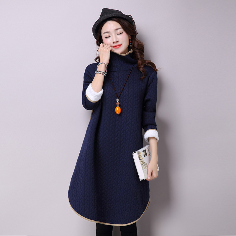 2015冬季新款民族風加厚加絨保暖麻棉圓領中長款棉麻連衣裙 /