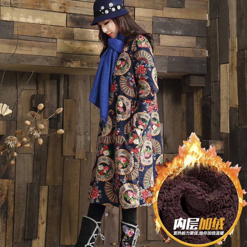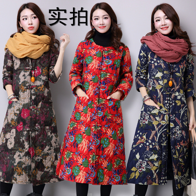 2015冬季新款民族風盤扣加長款棉襖圓領花棉衣外套文藝范棉袍 /