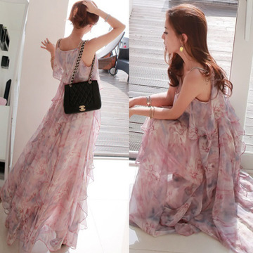 2016海邊度假荷葉邊吊帶印花沙灘裙雪紡性感波西米長裙顯瘦 /