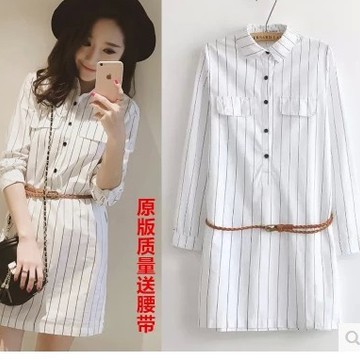 2016春裝韓版女裝翻領帶腰帶條紋襯衫連衣裙 /