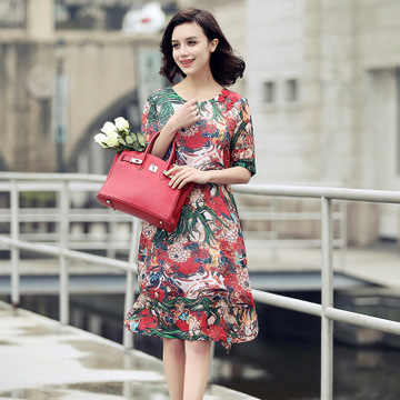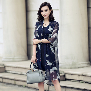 歐洲站2016新款女裝真絲連衣裙中長款圓領印花桑蠶絲連衣裙兩件套 /