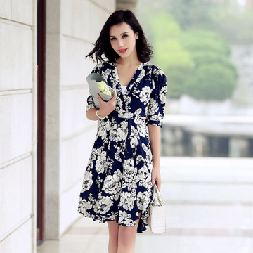 2016新款女裝高檔印花絲麻連衣裙夏季圓領五分袖度假沙灘裙中長款 /