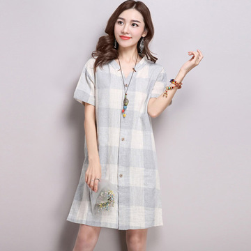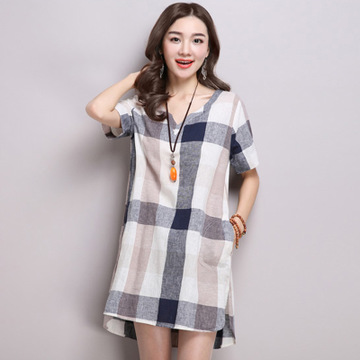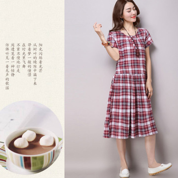 2016夏季新款短袖棉麻連衣裙女韓版寬松大碼女裝格子打底裙 /