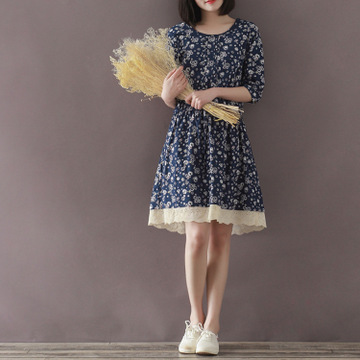 夏季新款典雅文藝復古棉麻純棉寬松大碼碎花連衣裙女蕾絲邊裙擺 /