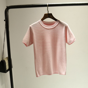 春新款韓國單經(jīng)典細(xì)條紋親膚質(zhì)感短袖針織衫圓領(lǐng)百搭顯瘦T上衣女 /