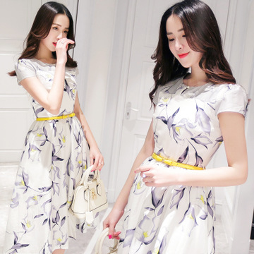 2016夏季新款韓版修身顯瘦淑女a字長裙子 印花連衣裙短袖中長款潮 /