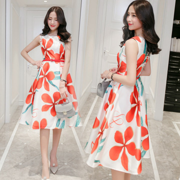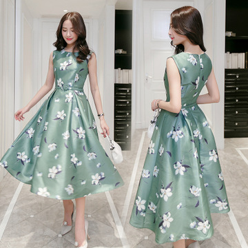歐洲站2016夏裝女裝韓版印花中長款無袖連衣裙大擺時尚A字裙 /