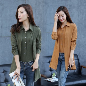 廠家直銷2016春裝新款韓版棉麻假兩件長袖襯衫修身中長款單排扣女 /
