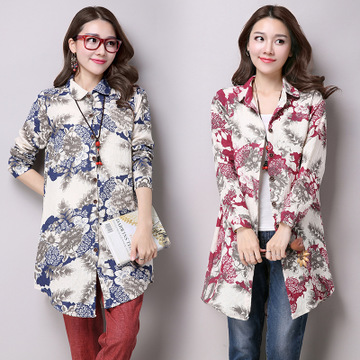 廠家直銷2016春款棉麻長袖名族風修身顯瘦中長款百搭印花襯衫女潮 /