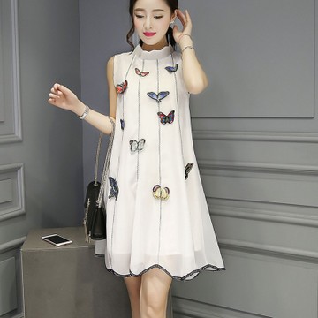 2016春季女裝刺繡蝴蝶花邊立領(lǐng)歐根紗優(yōu)雅A字仙美連衣裙 /
