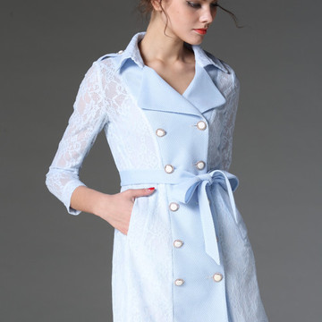 2016春裝外套新款歐式翻領大牌女士蕾絲拼水波紋風衣高檔大衣 /