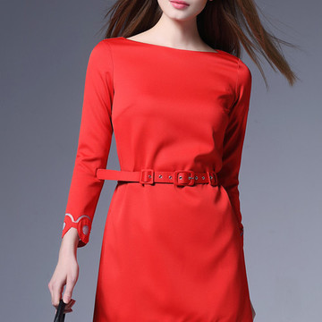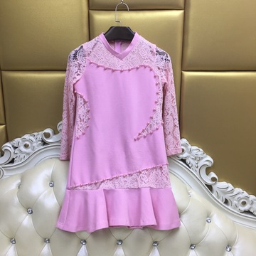 歐美2016春季女裝松緊腰蕾絲連衣裙中長款+圓珠粉紅色裙子 /