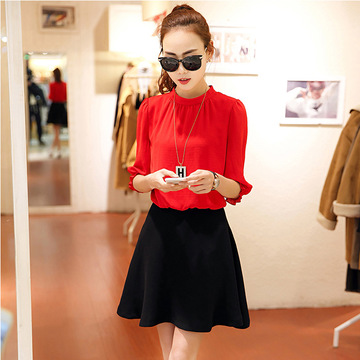 2016春裝新款女裝打底衫歐洲站修身中袖連衣裙雪紡衫a字套裝裙潮 /