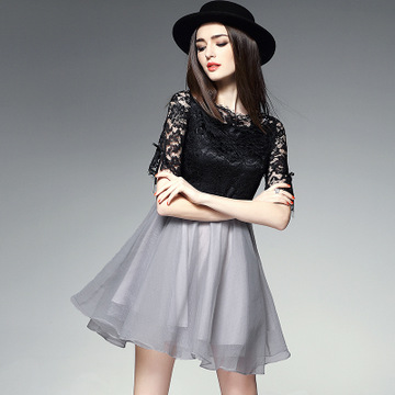 歐洲站 2016春夏新款女裝 時尚一字領鉤花鏤空高腰公主蕾絲連衣裙 /