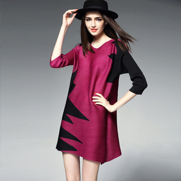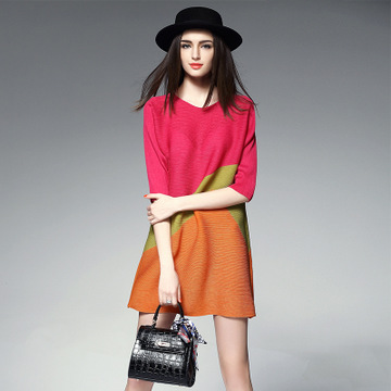 歐洲站 2016春夏新款女裝 時尚三宅褶皺五分袖 寬松圓領連衣裙 /