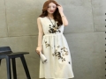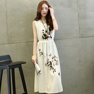 女生公社2016夏季新款棉麻連衣裙無袖水墨畫收腰復(fù)古文藝背心長裙 /