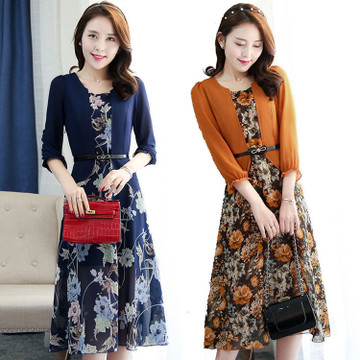 正品2016春夏季新款中年女裝韓版修身碎花中長款雪紡連衣裙氣質(zhì) /