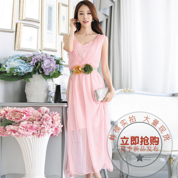 實拍2016夏季甜美純色顯瘦沙灘大擺波西米亞長款天絲連衣裙 /