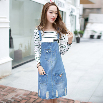 廠家直銷 2016韓版破洞牛仔背帶裙女 學(xué)生休閑時尚百搭牛仔連衣裙 /