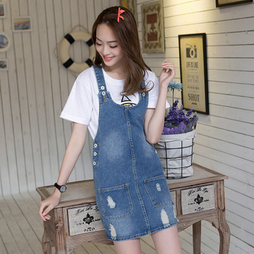 廠家直銷 夏季新款2016韓版牛仔背帶裙女 學(xué)生修身破洞百搭牛仔裙 /