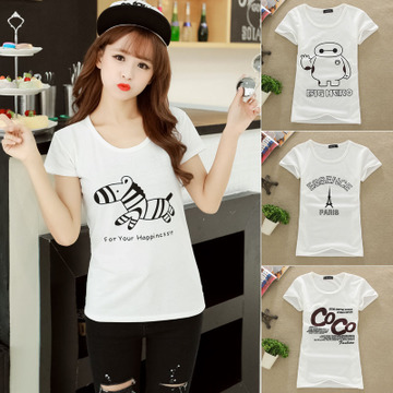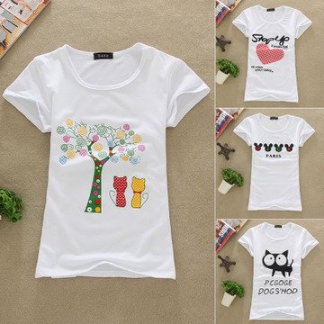 夏季新款女士上衣短袖t恤韓版圓領彈力顯瘦時尚印花半袖打底衫 /