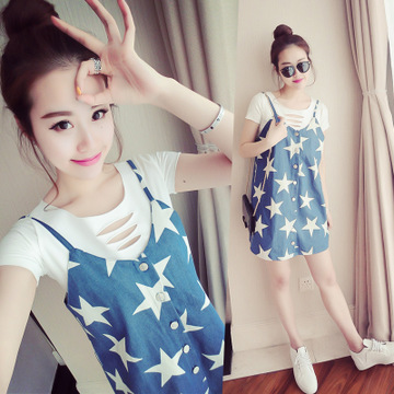 夏季新品歐美風吊帶性感牛仔裙 紐扣印花時尚街頭連衣裙 /