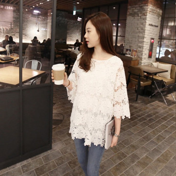 2016春季新款小香風甜美性感鏤空寬松打底衫上衣蕾絲衫 /