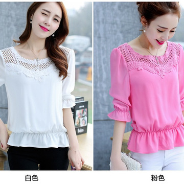 2016新款韓版女裝大碼寬松打底襯衫上衣蕾絲衫短袖t恤女雪紡衫 /