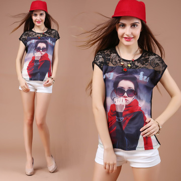 2016女式雪紡衫蕾絲衫夏裝新款潮印花寬松短袖打底T恤 /