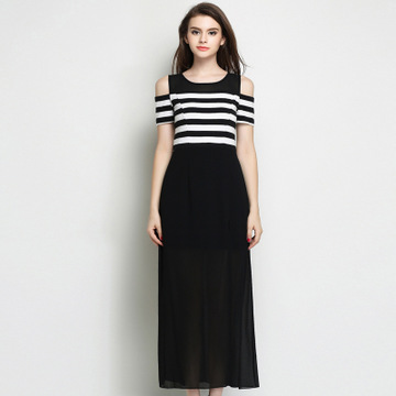 歐洲站2016夏裝新款時尚露肩撞色拼接雪紡高腰短袖連衣裙女長裙 /
