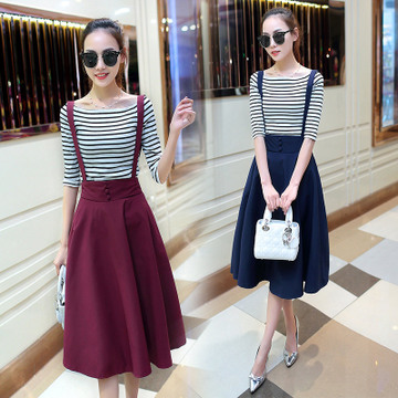 夏季韓版女裝條紋上衣吊帶裙兩件套T恤背帶裙套裝中袖百褶中長(zhǎng)裙 /