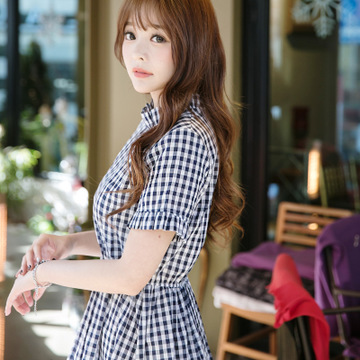2016新款夏季韓版小清新純棉短袖格子連衣裙大碼潮流新品學生裝女 /