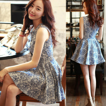 2016夏裝新款韓版青花瓷百褶連衣裙印花吊帶蓬蓬短裙無袖背心裙子 /
