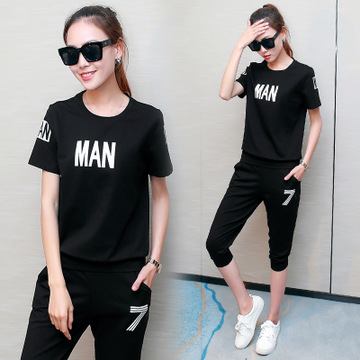 運動套裝女夏裝新款短袖運動服七分褲時尚兩件套休閑套裝一件代發 /
