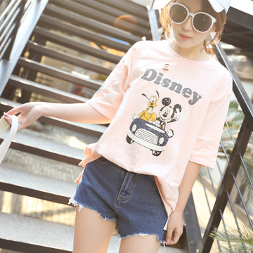 2016夏季最新女裝 韓國學院風純棉破洞女士卡通短袖T恤上衣 批發 /