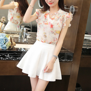 2016夏季新款時尚優雅女裝 小香風碎花雪紡上衣蕾絲短裙休閑套裝 /
