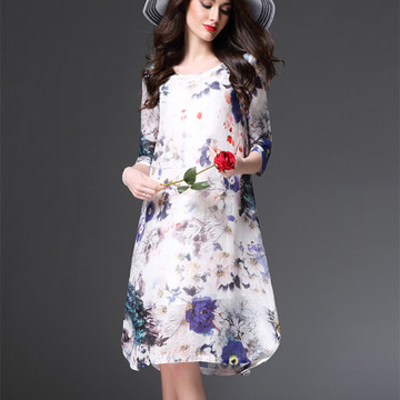 2016夏季新款女裝中長(zhǎng)款五分袖真絲印花裙寬松大碼絲麻連衣裙批發(fā) /