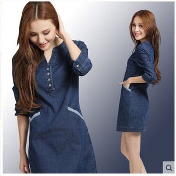 2016夏新款韓國(guó)代購(gòu)春秋休閑寬松牛仔裙a字中長(zhǎng)款七分長(zhǎng)袖連衣裙 /